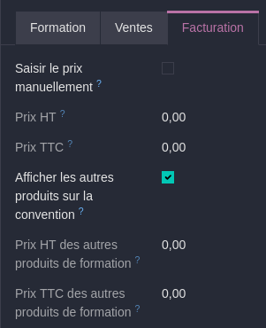 - Si la coche 'saisir le prix manuellement' est active sur la convention de formation alors les champs prix HT et TTC sont masqués.
