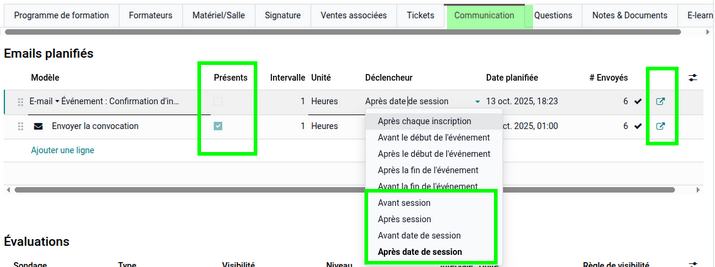 peuvent être programmés au niveau des sessions et des dates de session via l'onglet communication !